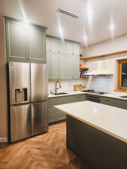 מטבח בעיצוב כפרי עדין, בגוון מרווה טבעי, בתכנון אישי ושימוש בחומרים איכותיים – שילוב של אסתטיקה ונוחות יומיומית.